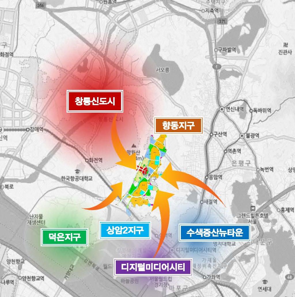수변에 위치하고 있어서 탁월한 전망과 개방감을 누릴 수 있고, 자연친화적인 환경이 근접해 있으면서도 중심상권에 위치해 있어서 향동지구에서 가장 활성화 될 위치라고 보시면 됩니다. 행정구역상 고양시에 속하지만 서울 상암이나 은평구 생활권역이라고 봐도 무방할 만큼 거리적으로 가깝고, 미디어기업이 대거 포진해 있는 상암DMC지역과 마곡지구, 덕은지구와 함께 산업클러스터를 형성할 것으로 보여집니다.