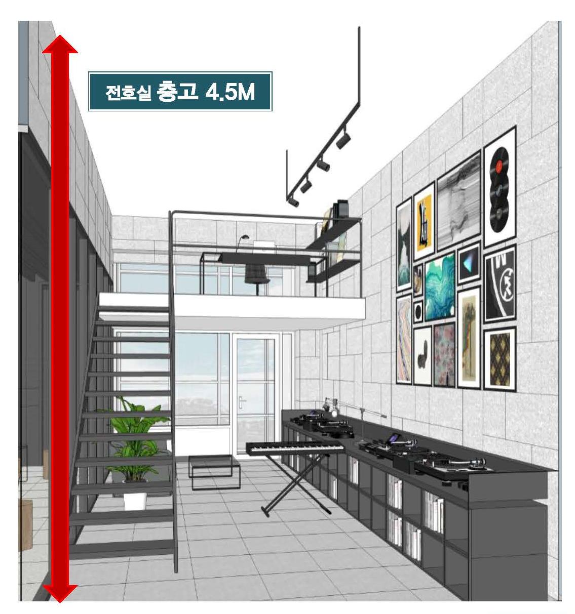 층고도 4.5m로 높기 때문에 기존 오피스보다 개방감이 탁월하고 공간활용도가 높습니다. 이러한 확장성은 소규모 사업자들에게 매력적일 수 밖에 없고, 4차산업의 출현과 함께 파생된 각종 IT&지식산업에 적합하게 사무실을 꾸미기 용이합니다.
